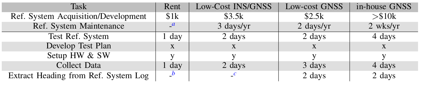 Consider a data collection and analysis campaign to collect data from a device under test (DUT) along 2 test paths and analyze heading accuracy. The estimated effort required to fulfill this campaign is captured in Table II for four categories of reference systems. The key observations from this table are: