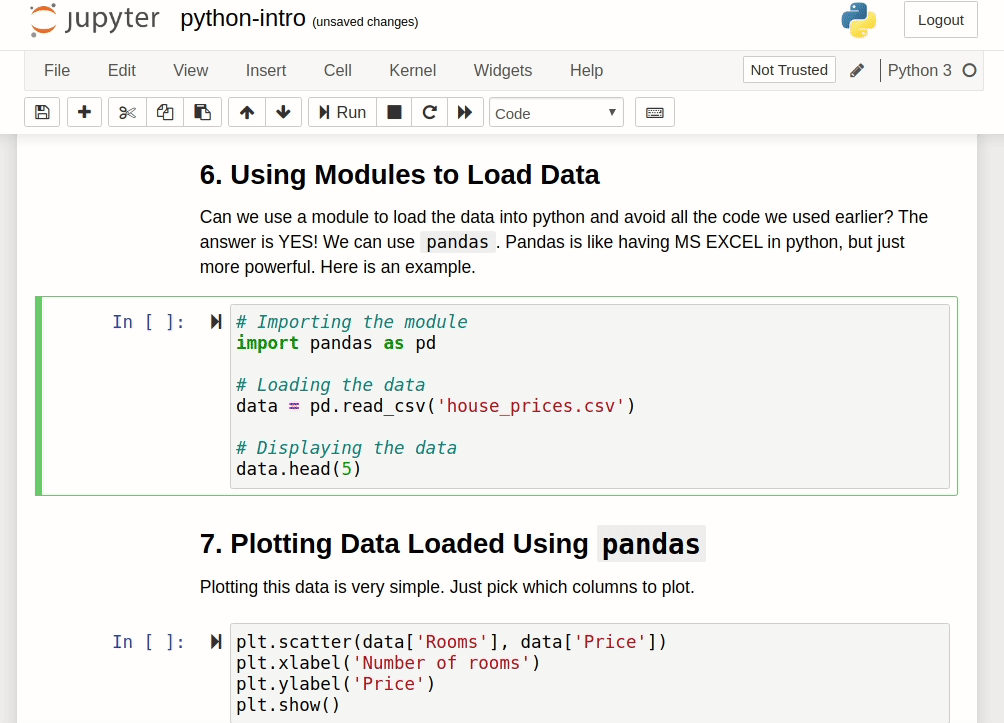 In our Getting Started with Python for Data Analysis online workshop we show how to setup Jupyter for data analysis. Once the environment in setup, you can run code as cells, edit existing cells, add new cells, run all the cells, and so on.