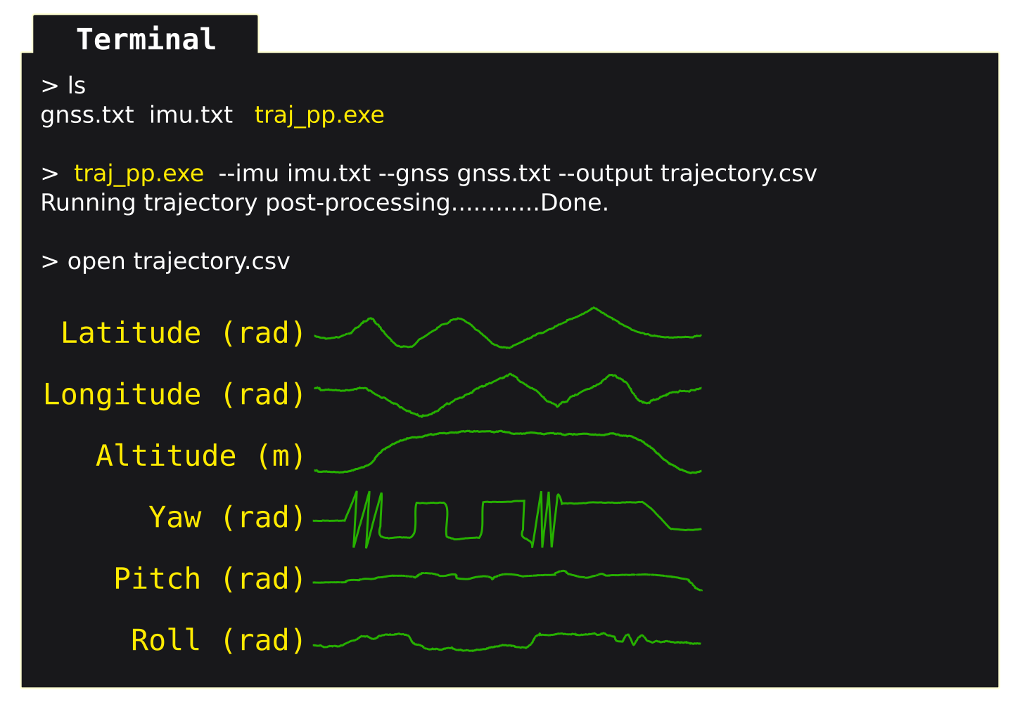 > traj_pp.exe --imu IMU.txt --gnss GNSSPVT.pos --output trajectory.csv